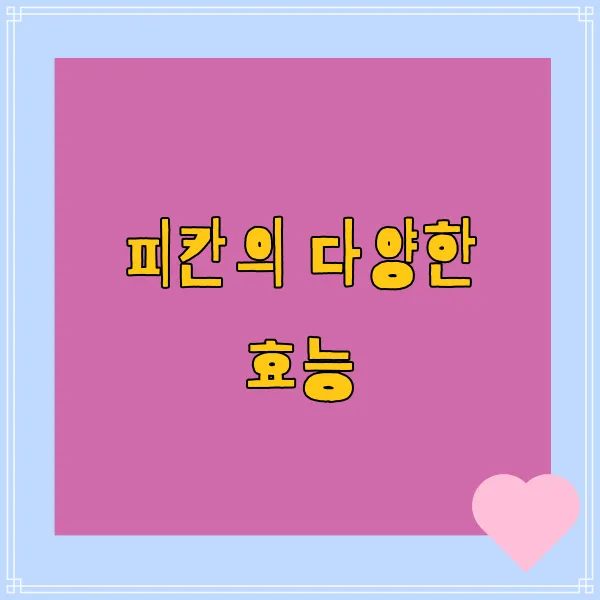 자, 이제 피칸의 놀라운 효능에 대해 본격적으로 파헤쳐 볼까요? 피칸은 단순히 맛있는 간식을 넘어, 우리 몸에 다양한 이점을 제공하는 '영양 폭탄'이라고 할 수 있어요! 💪 풍부한 영양 성분 덕분에 꾸준히 섭취하면 건강 관리에 정말 큰 도움이 된답니다. 😊
